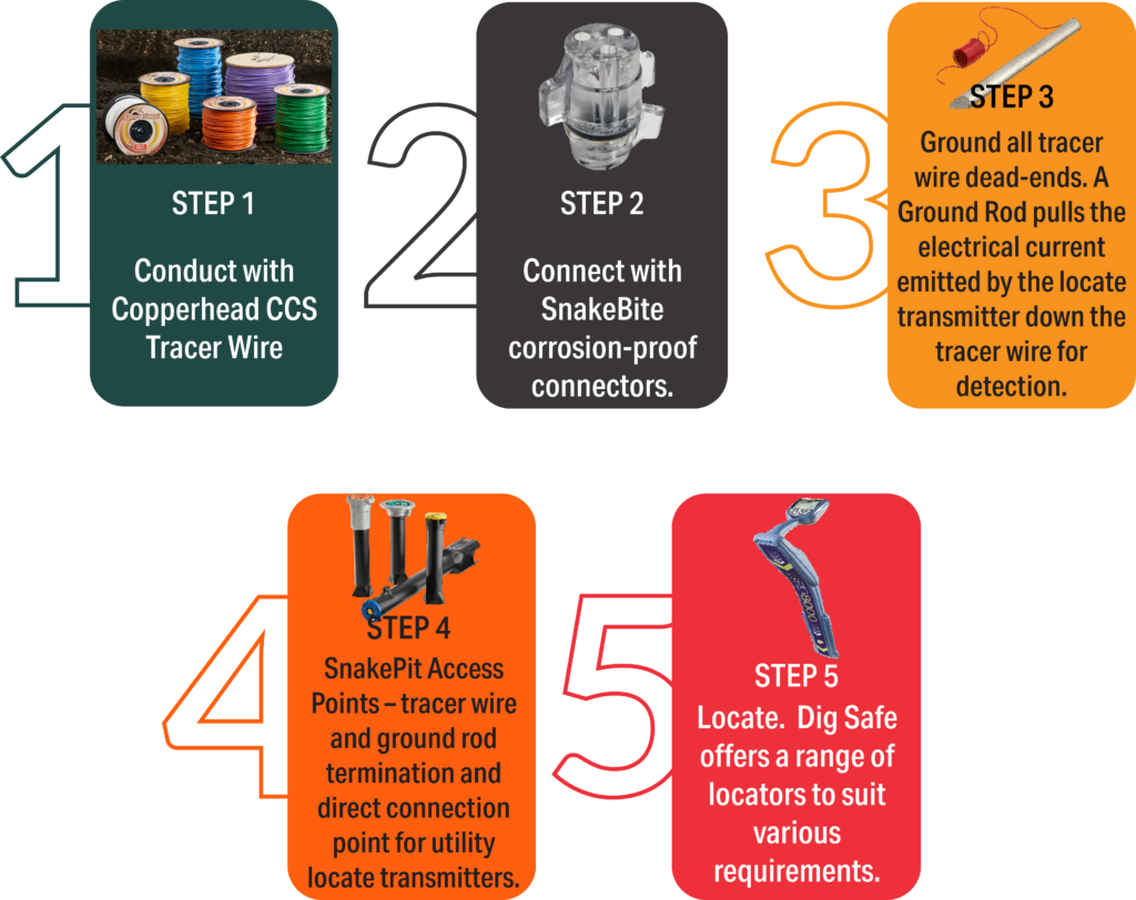 The Complete Utility Locating System® is five simple steps to keeping underground assets safe. It includes Copperhead® copper-clad steel tracer wire, corrosion-proof locking connectors, drive-in magnesium ground rods, access points, and locating equipment to provide the most reliable end-to-end signal for your utility locating services.