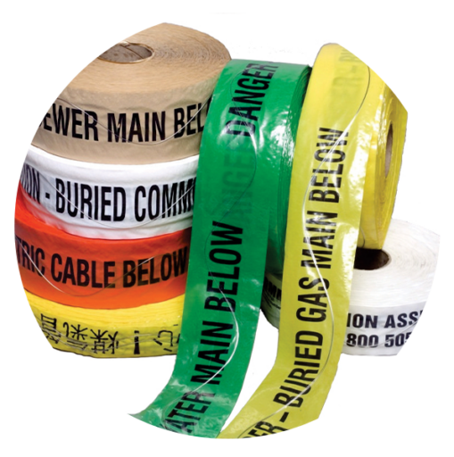 The top print guard layer protects the warning message and locks in the tracer wire. Standard-size rolls are 100mm x 250m.